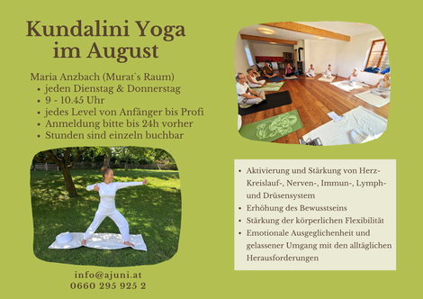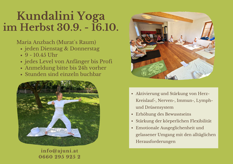Wenn auch du die heilsame, ausgleichende und stärkende Wirkung des Kundalini Yoga spüren und Teil einer unterstützenden Gemeinschaft, die auch sehr gern lacht und das Leben genießt, werden möchtest, dann komme gern auf eine Schnupperstunde vorbei. Die Herbstkurse in Maria Anzbach, Eichgraben und Neulengbach beginnen am 10. September. Der Kurs in St.Pölten startet ab 3. Oktober. Unter den unten stehenden Links kannst du dich weiter informieren. Wenn du in den Newsletter von Ajuni - Kundalini Yoga aufgenommen werden möchtest, dann schreibe eine kurze Mail "Newsletter-Anmeldung" an info@ajuni.at.